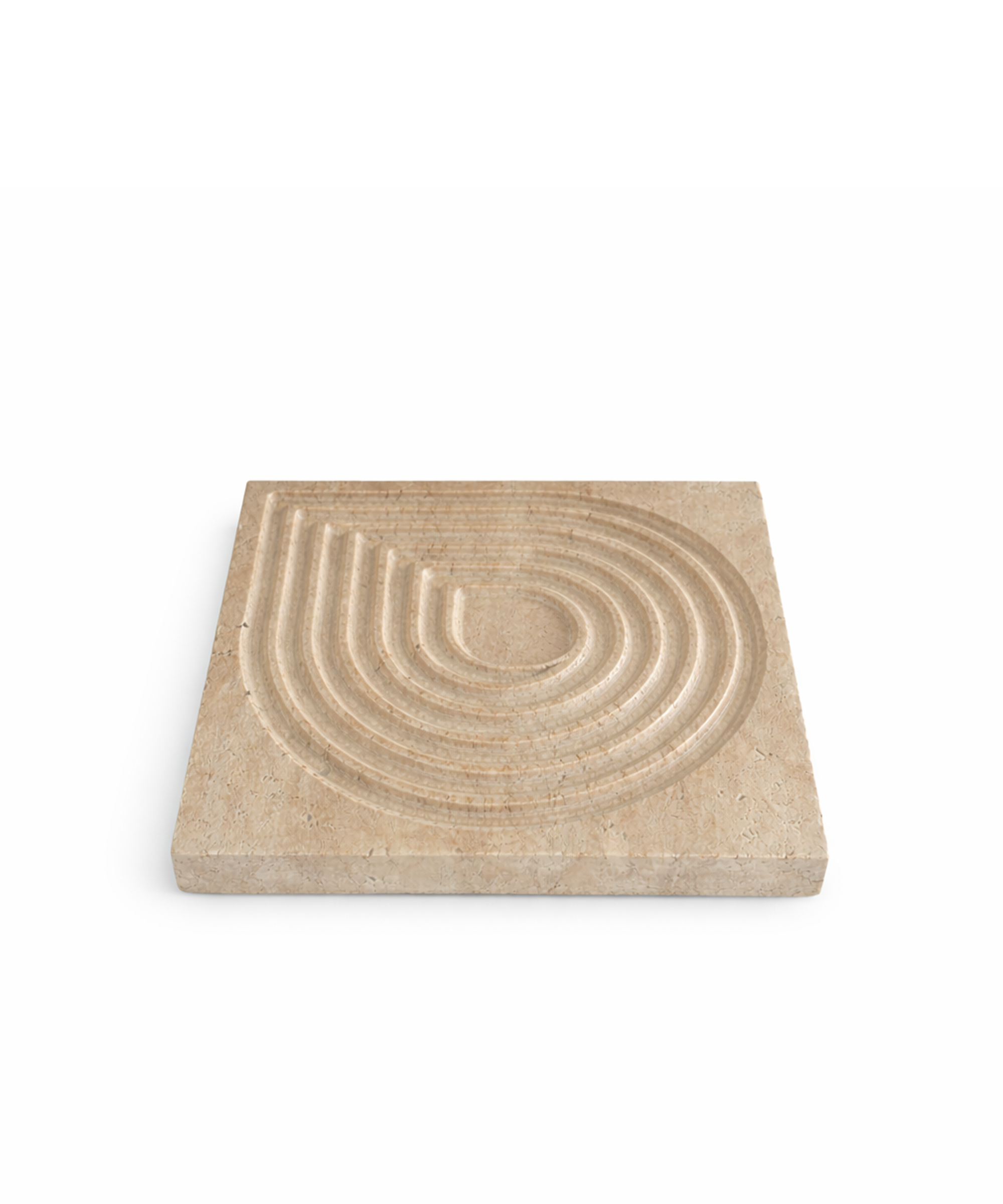 Reminiscent of Japanese karesansui sand gardens. Defined by clean lines and a carved concentric arch design, the Form Travertine Tray adds an architectural element to any surface. Use it as a catchall, decorative base for candles, or as a minimalist art piece on its own.
